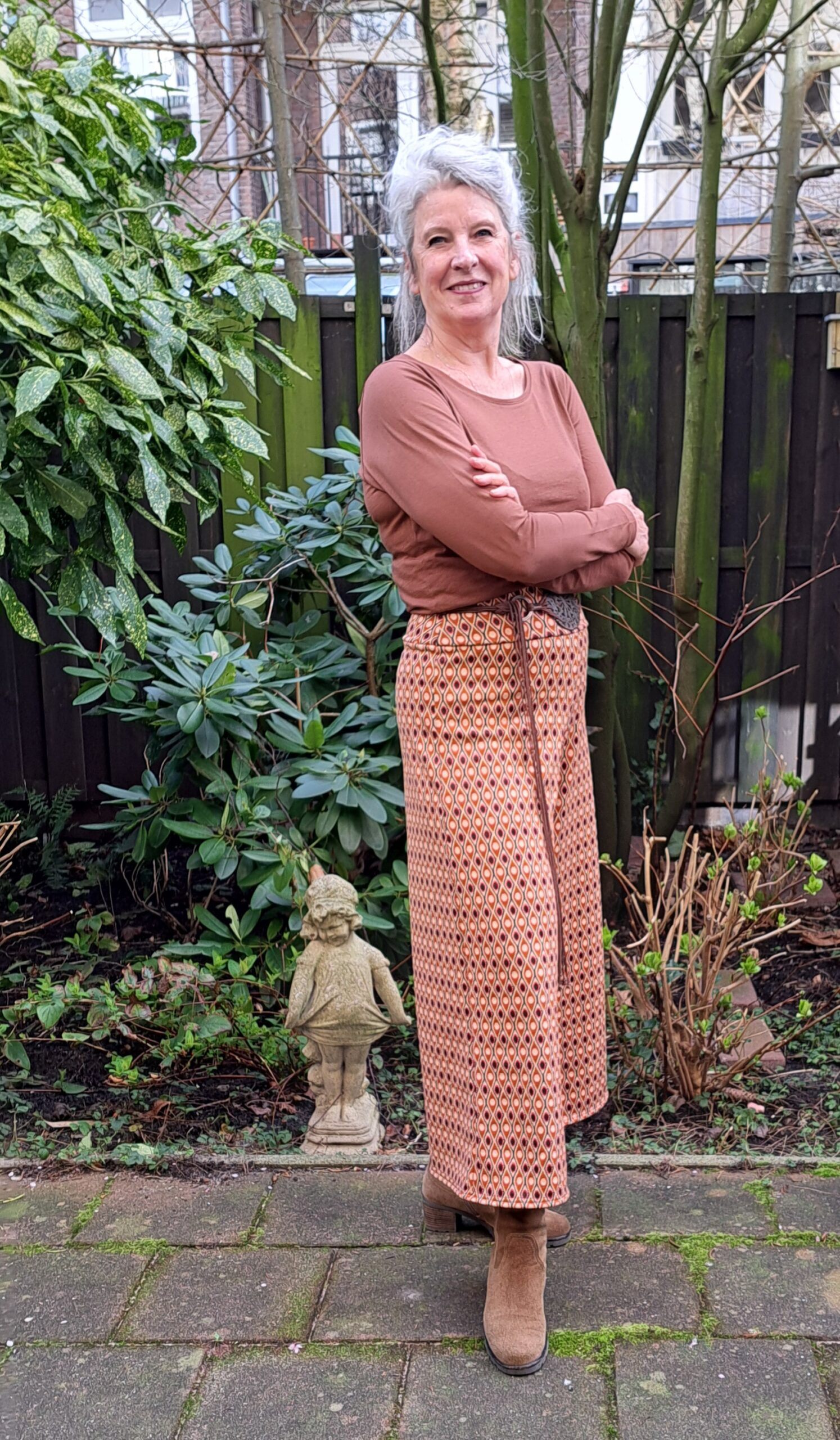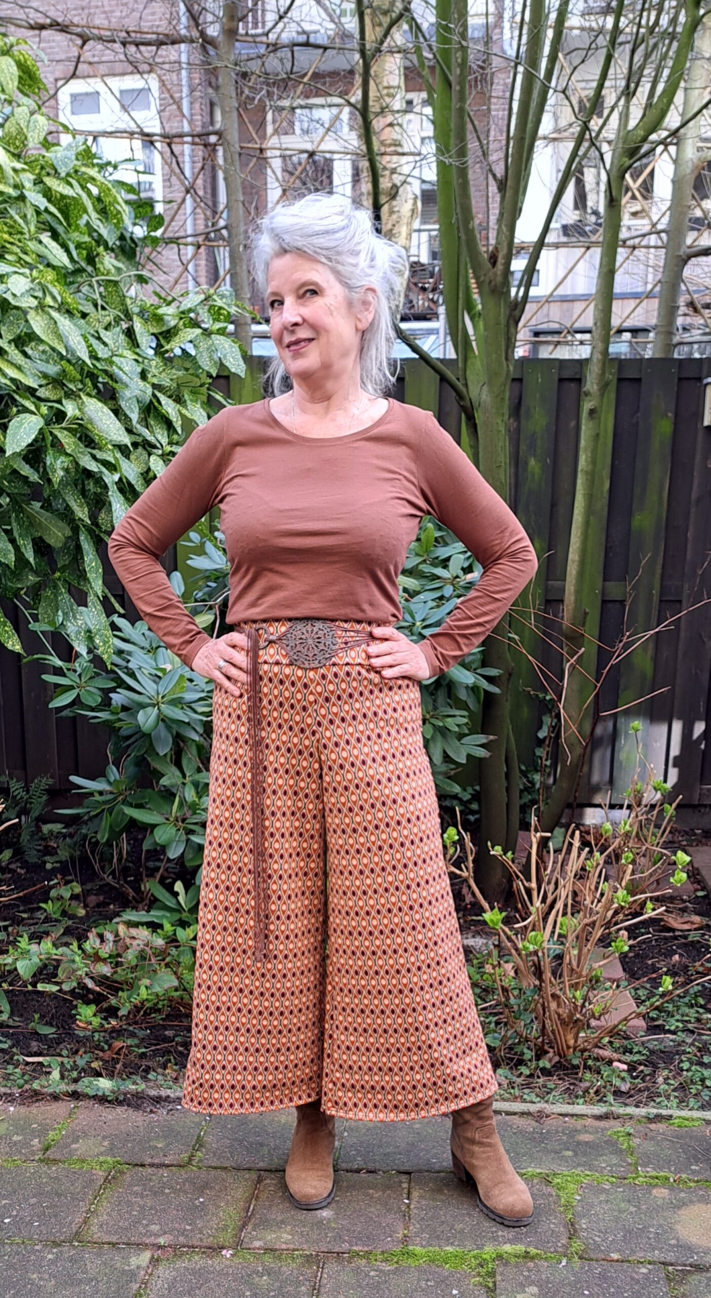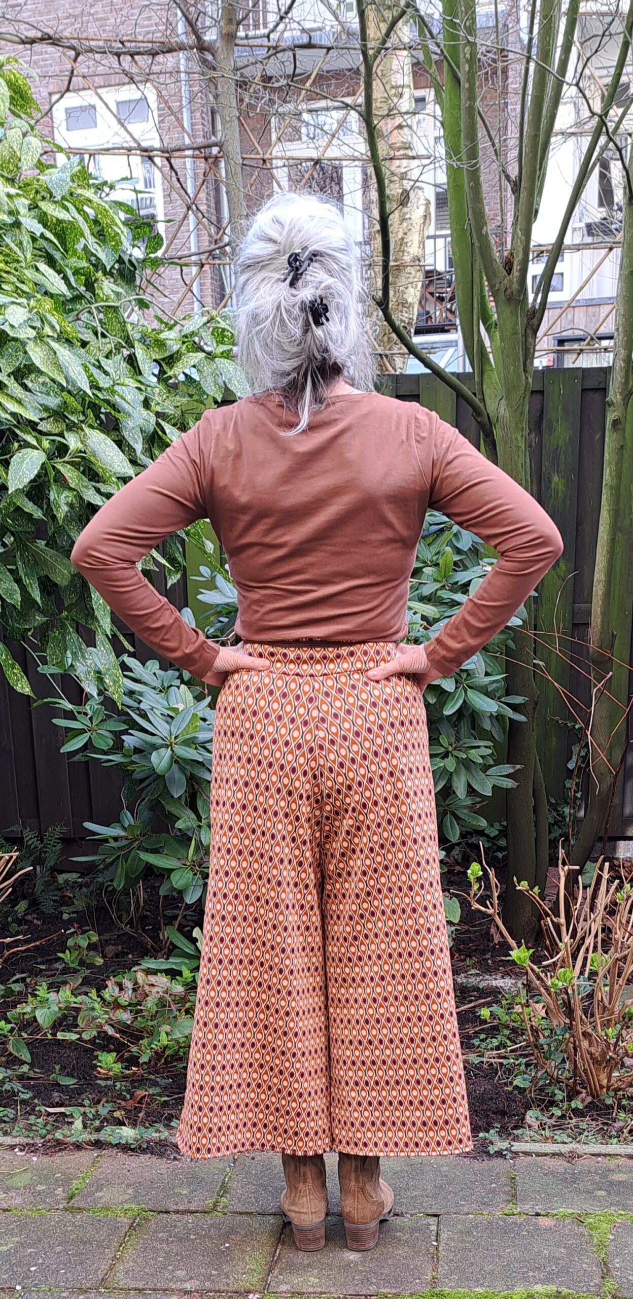 Wijde broek met band hoog in de taille. Soepele stof met de kleuren oranje, zwart, rood en ecru/beige. 78% polyester, 20% viscose en 2% elasthane.