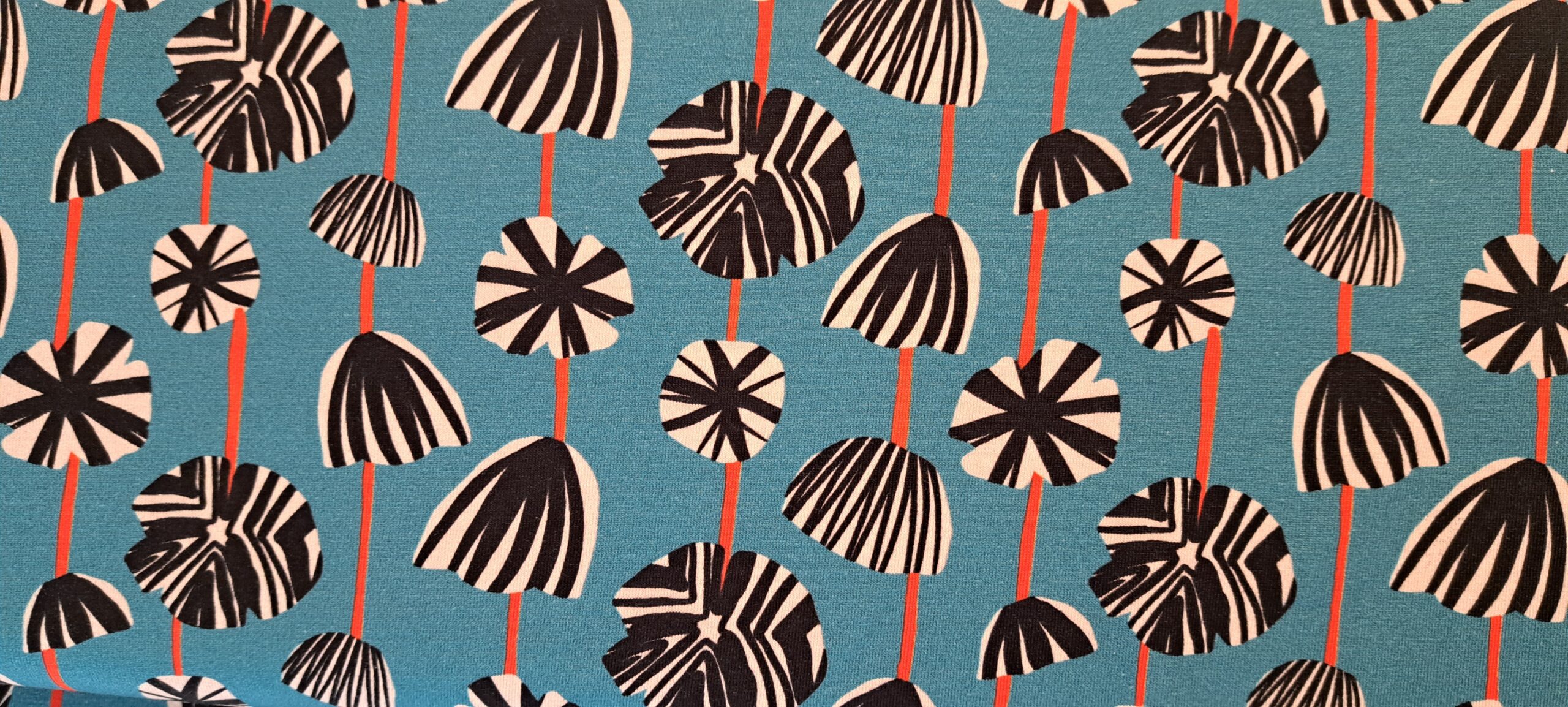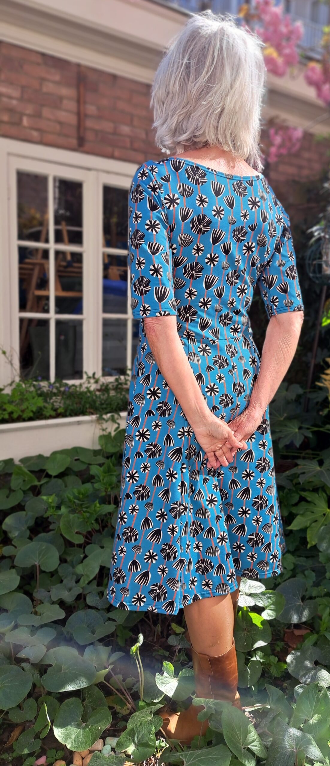 Jurk met boothals en mouw net over de elleboog. Blauw/turquoise ondergrond met zwarte bloem en oranjerood steeltje.