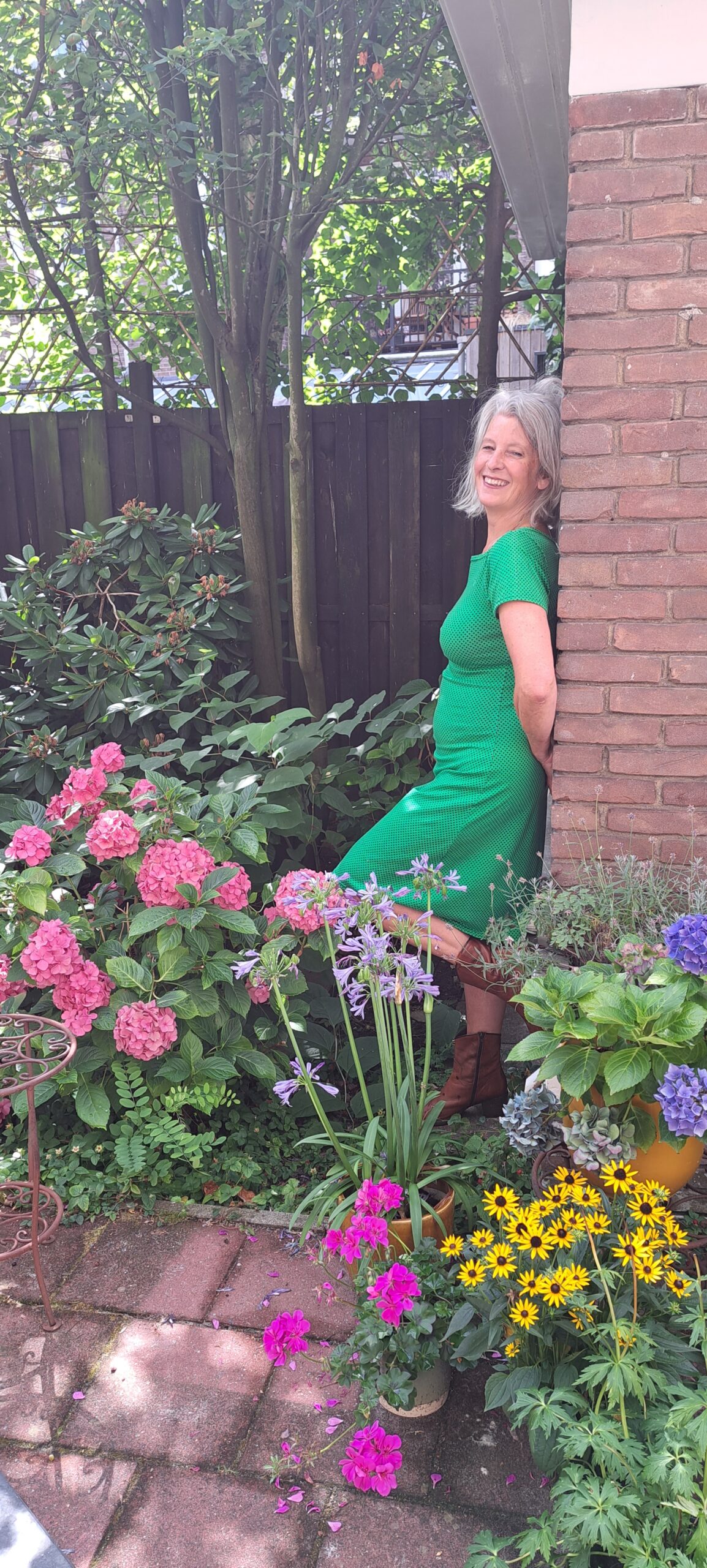 Jurk, fris groen met donkerblauw stipje. Iets lagere hals en korte mouwtjes. 95% katoen, 5% elasthan