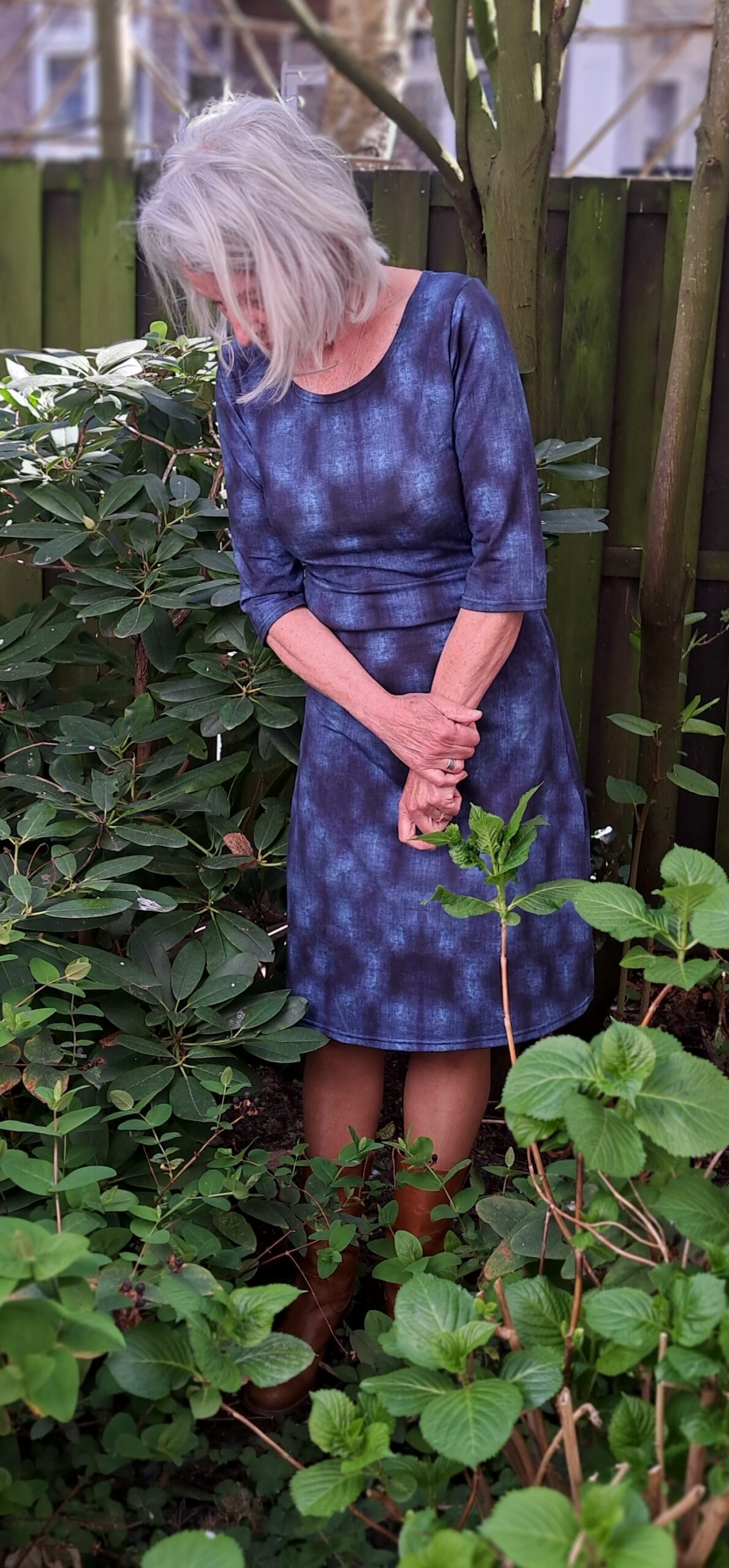 Jurk met ronde hals en 3/4 mouw. In verschillende kleuren blauw.