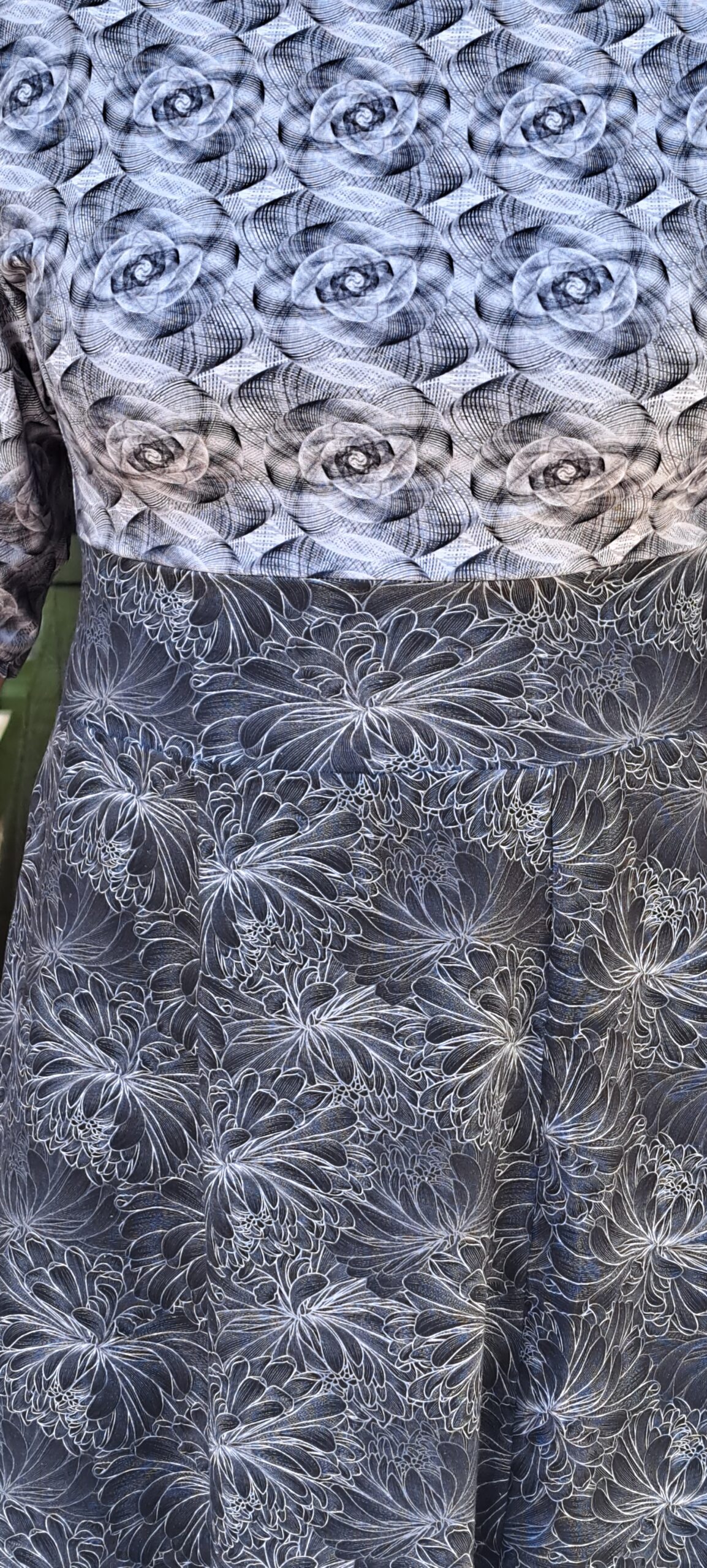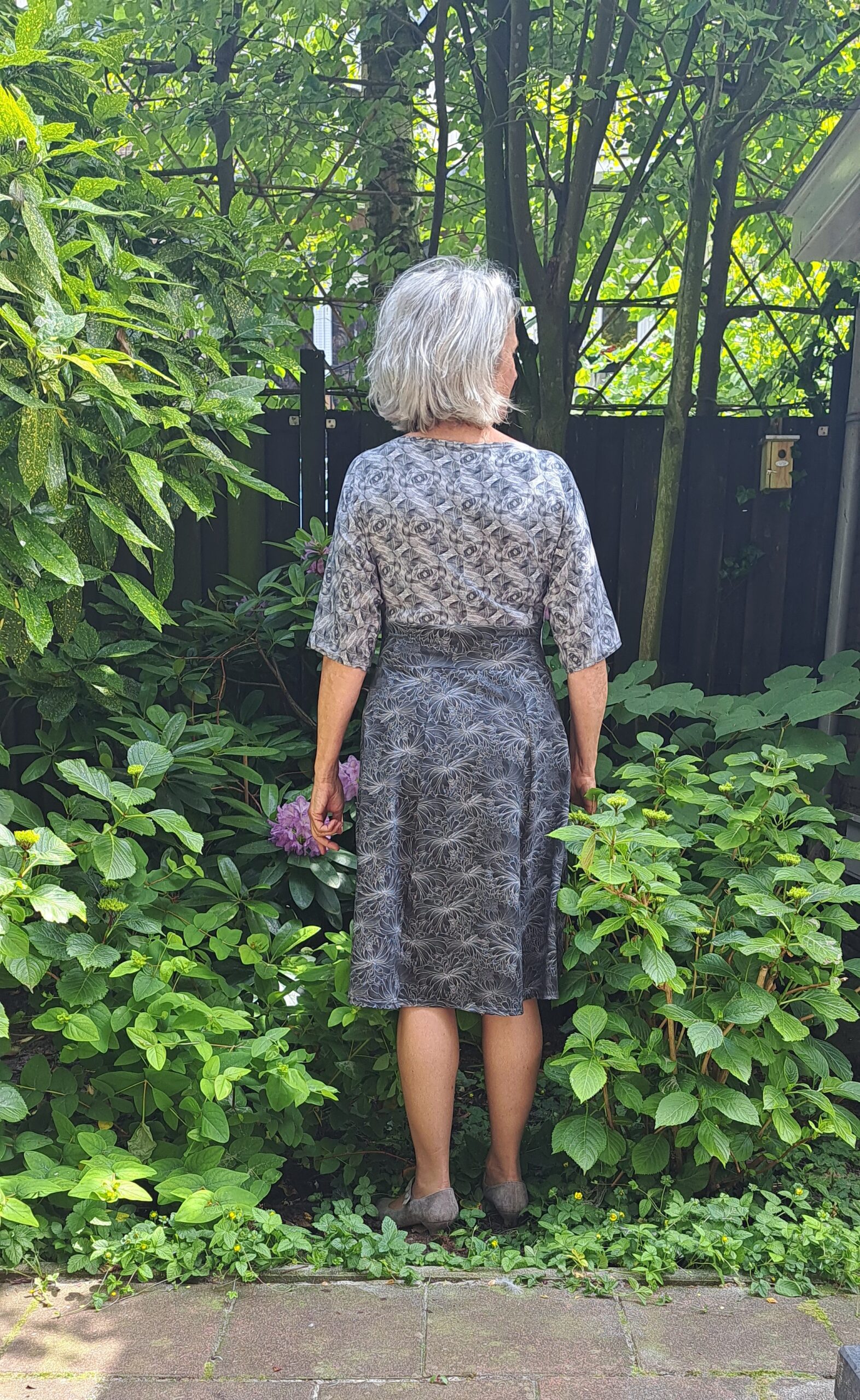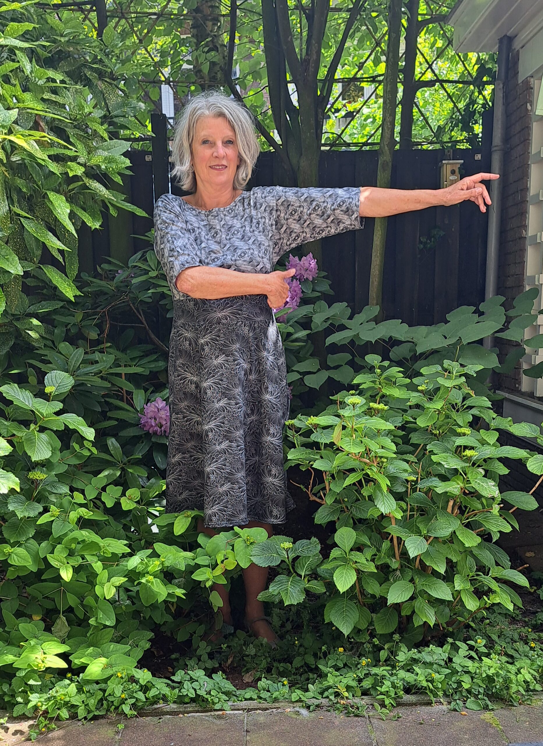 Jurk met aangeknipte mouw en een iets lagere hals. Twee verschillende maar natuurlijk bij elkaar passende stoffen, antraciet en ecru. Wijdere mouw tot de elleboog en band in de taille.