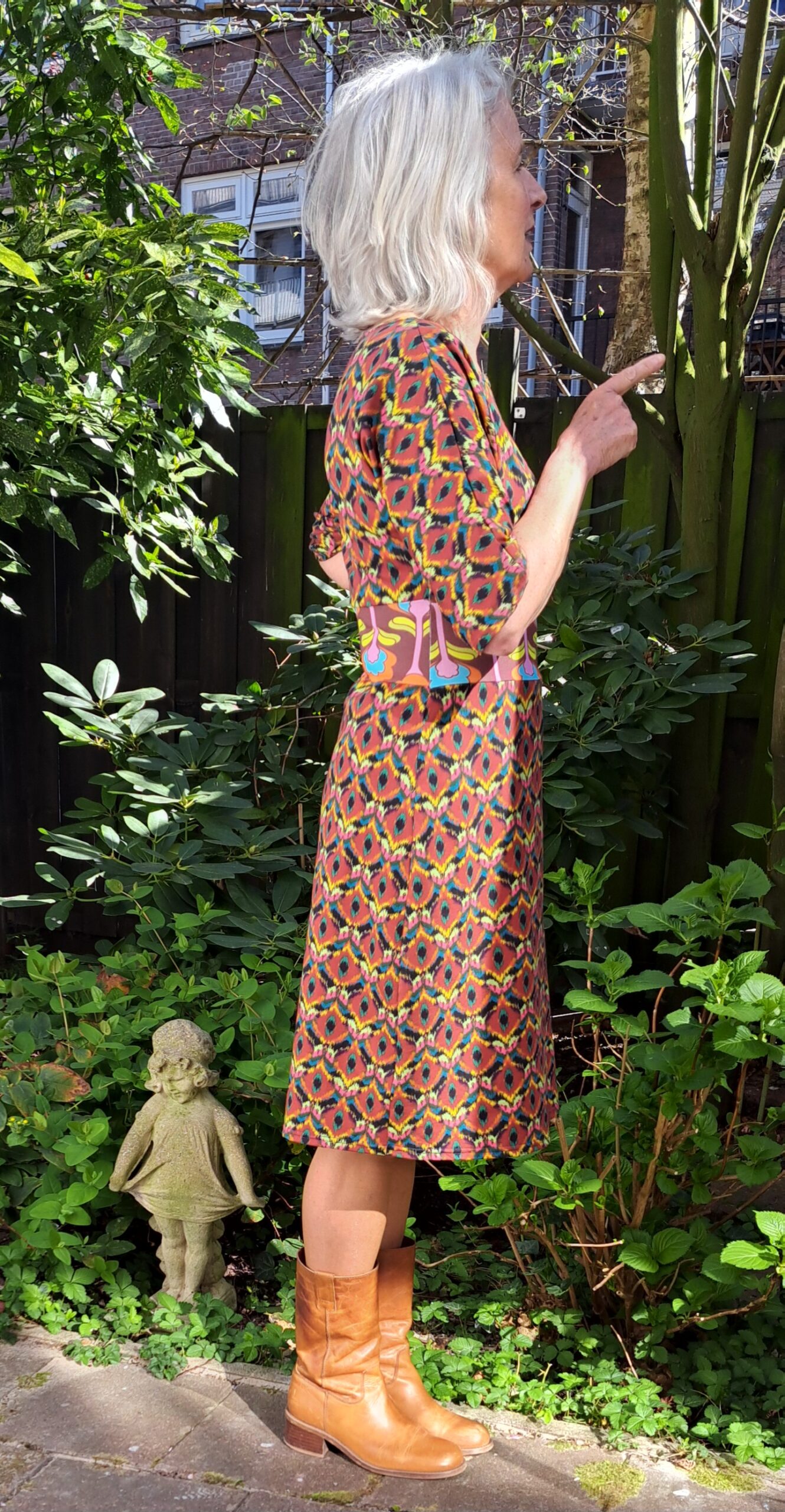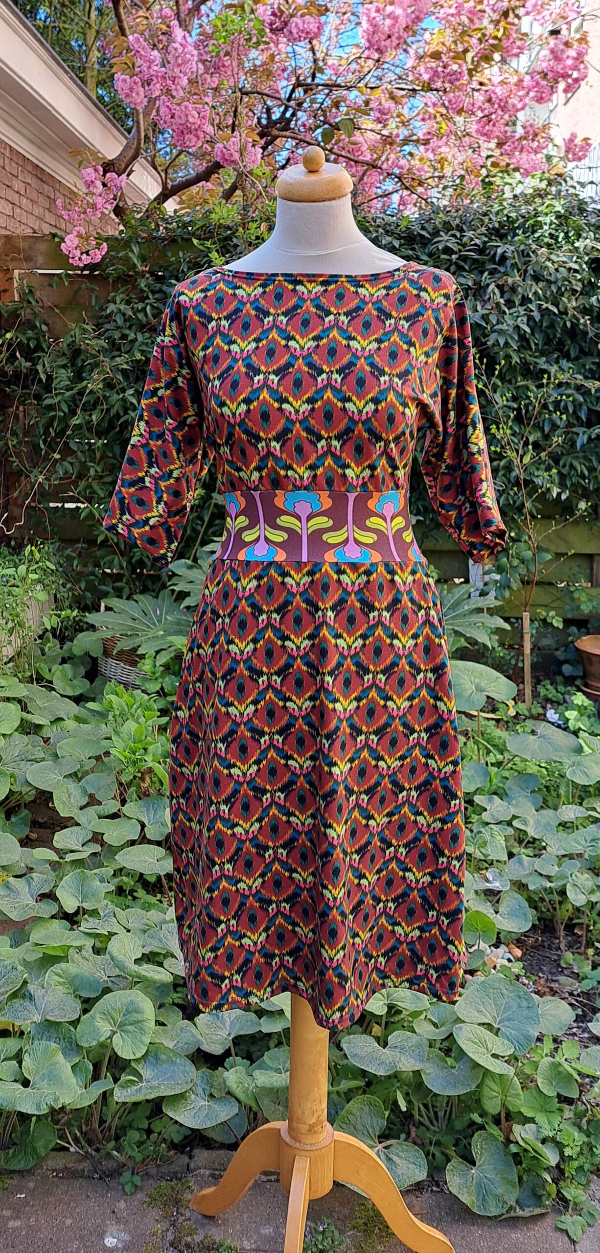 Jurk met boothals en aangeknipte mouw die net over de elleboog valt. Detail van bijpassende stof in de taille.