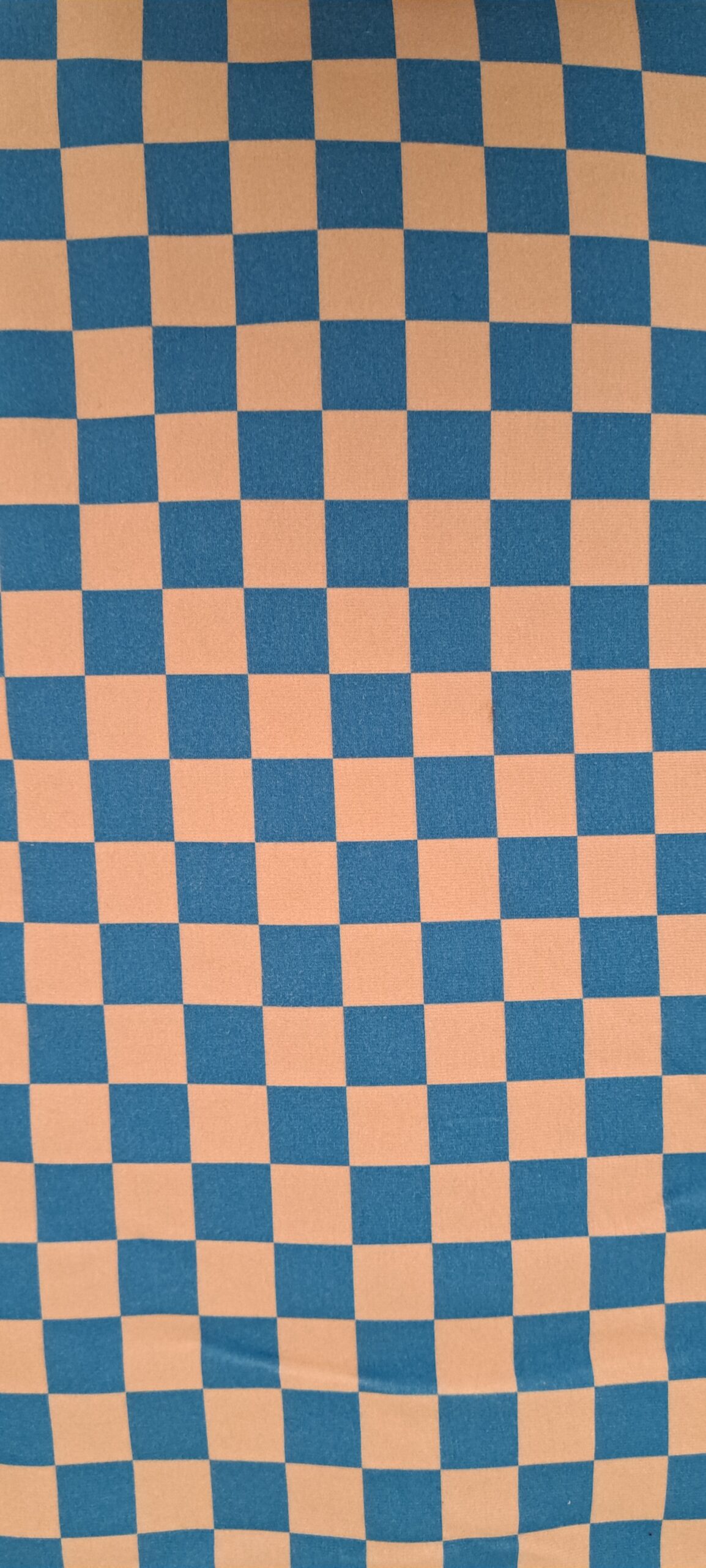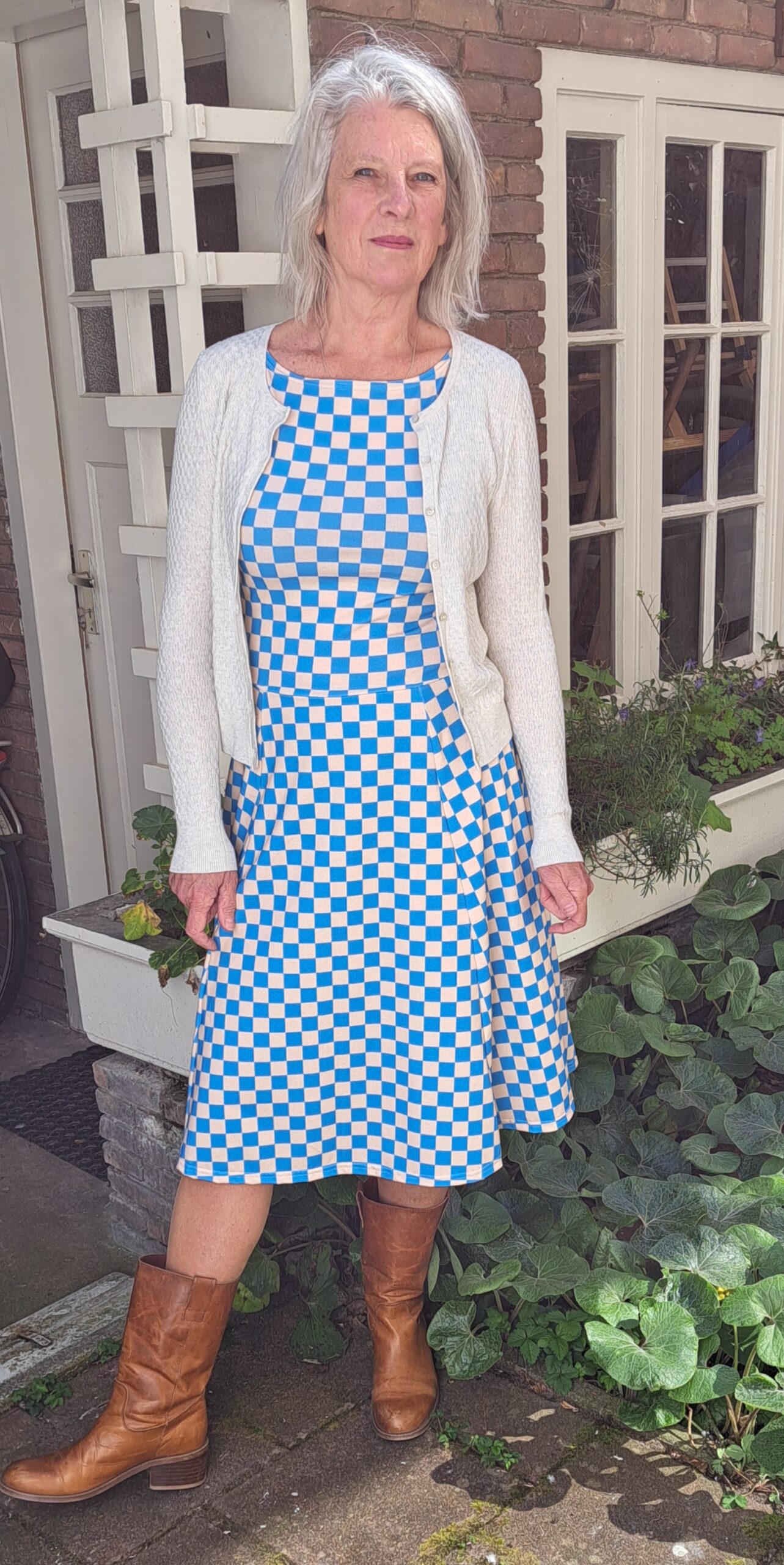 Jurk van biologisch katoen met boothals en zonder mouw. Blokjes in de kleuren helder blauw en ecru.