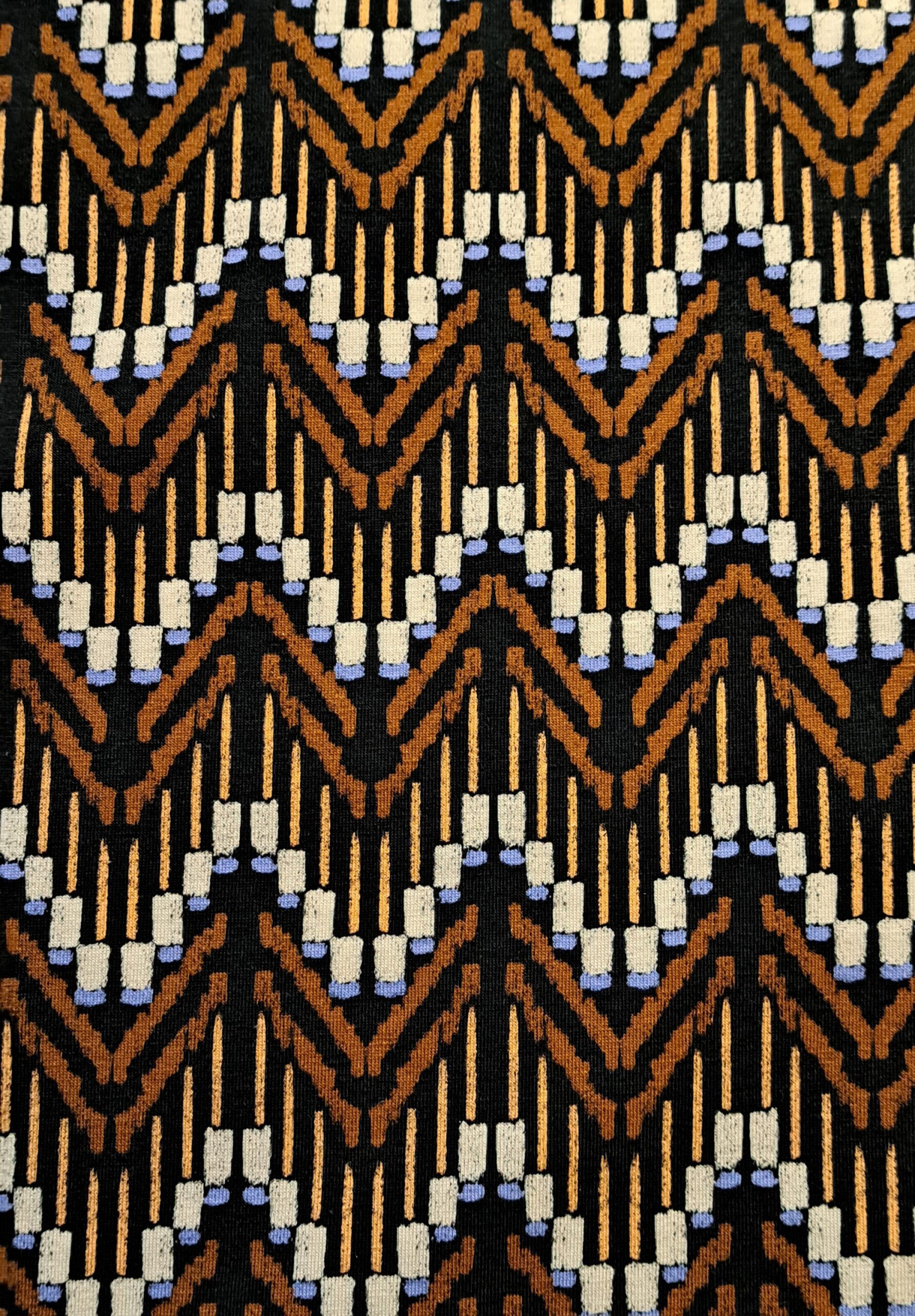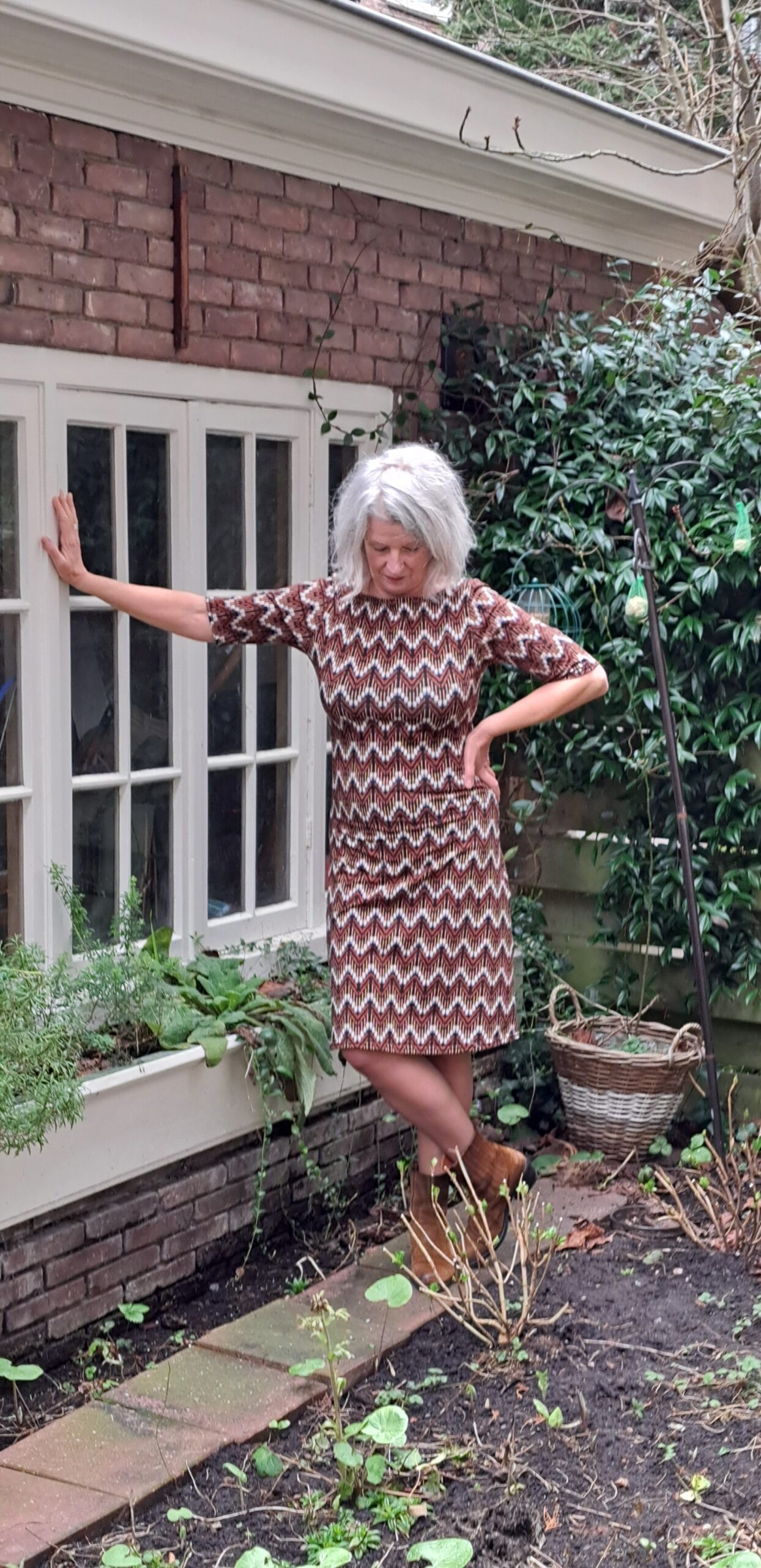 Jurk met boothals en mouw net over de elleboog. Zwarte ondergrond met de kleuren bruin, zalm, ecru en een beetje lavendel.