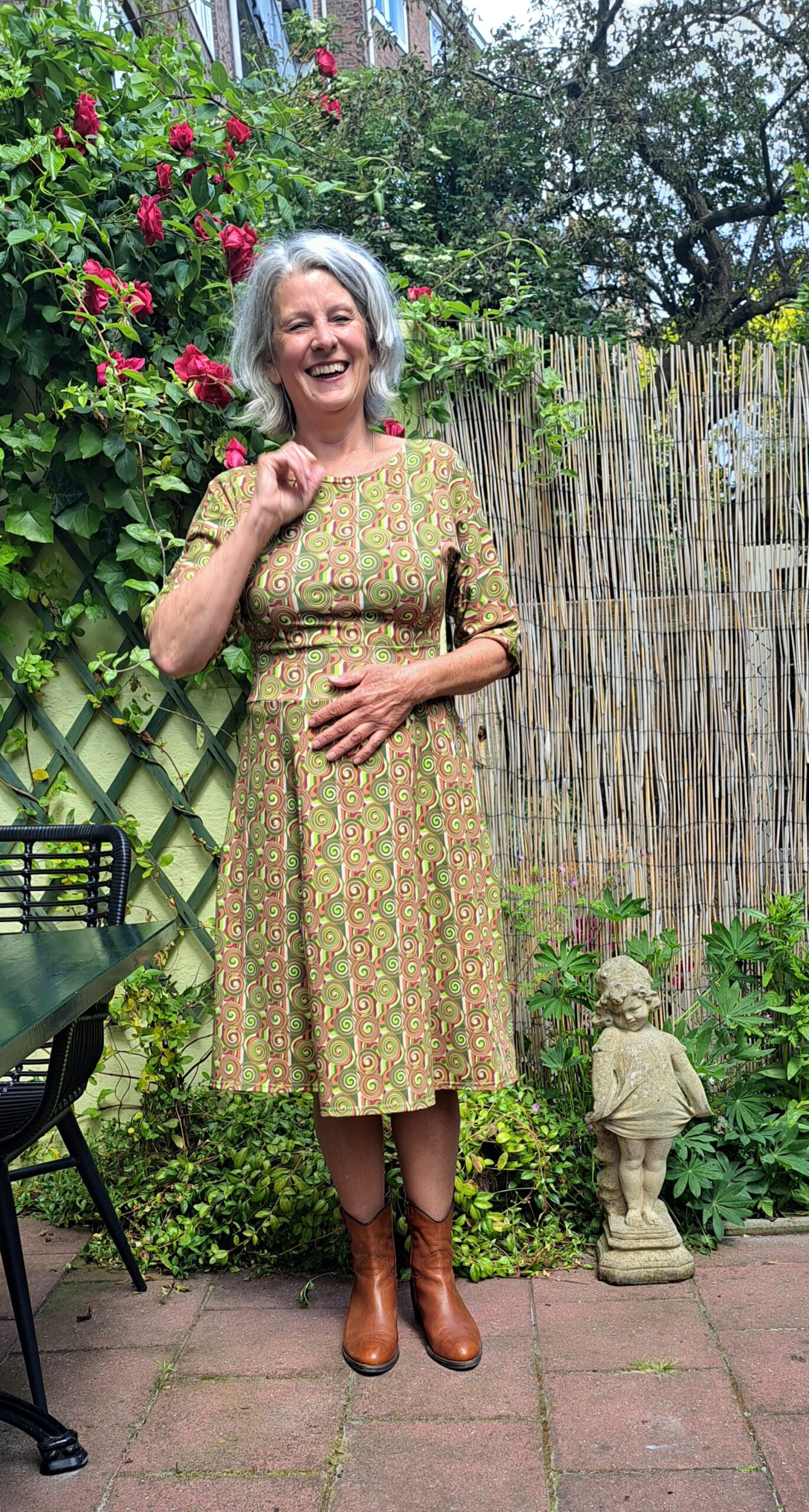 Blauwgrijze jurk met grijze stipjes. Ronde hals met plooitjes, band in de taille en mouwtjes met boord. 95% katoen, 5% elasthane