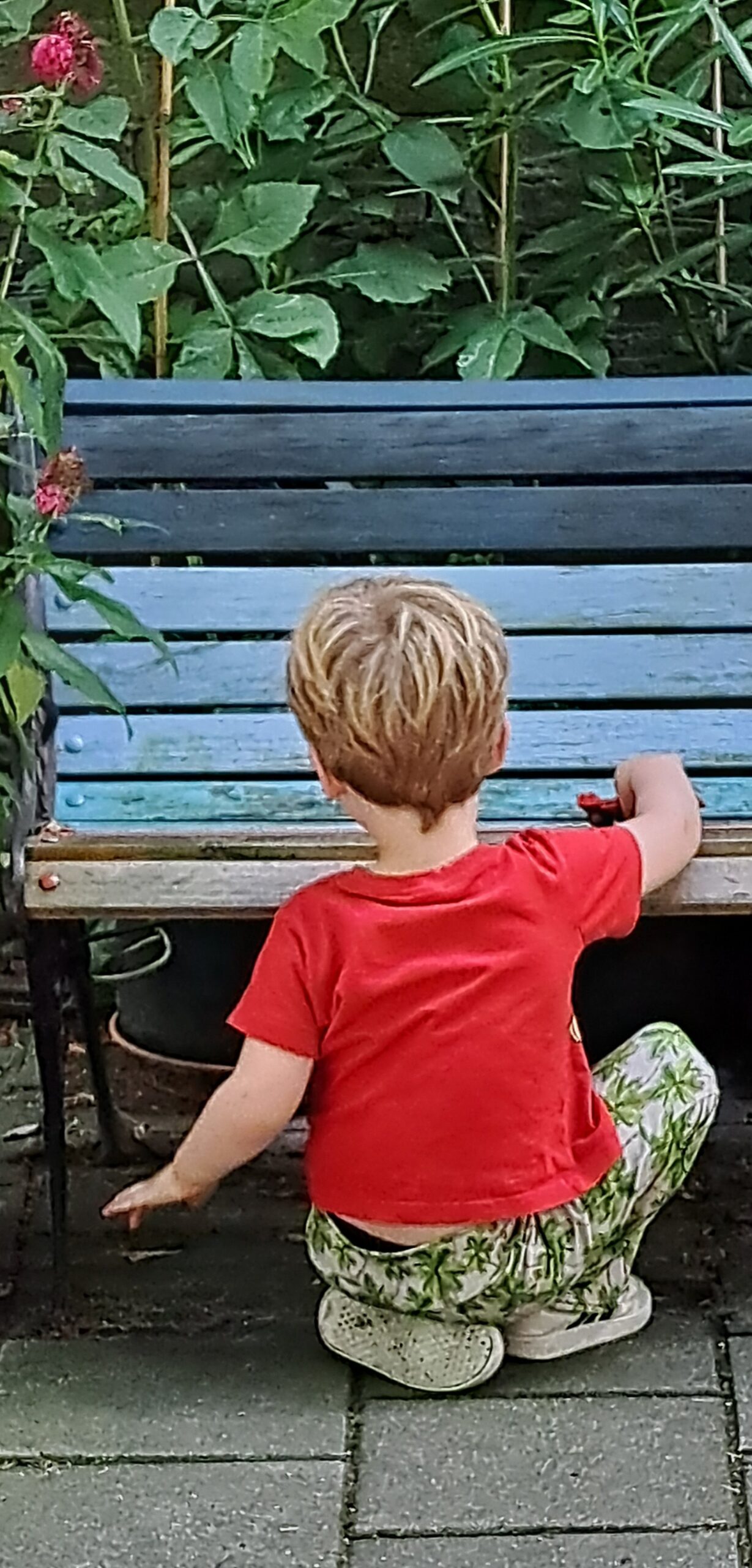 Broekje met een print van palmbomen op een lichte ondergrond. Met iets uitlopende pijpen. 95% katoen, 5% elasthane