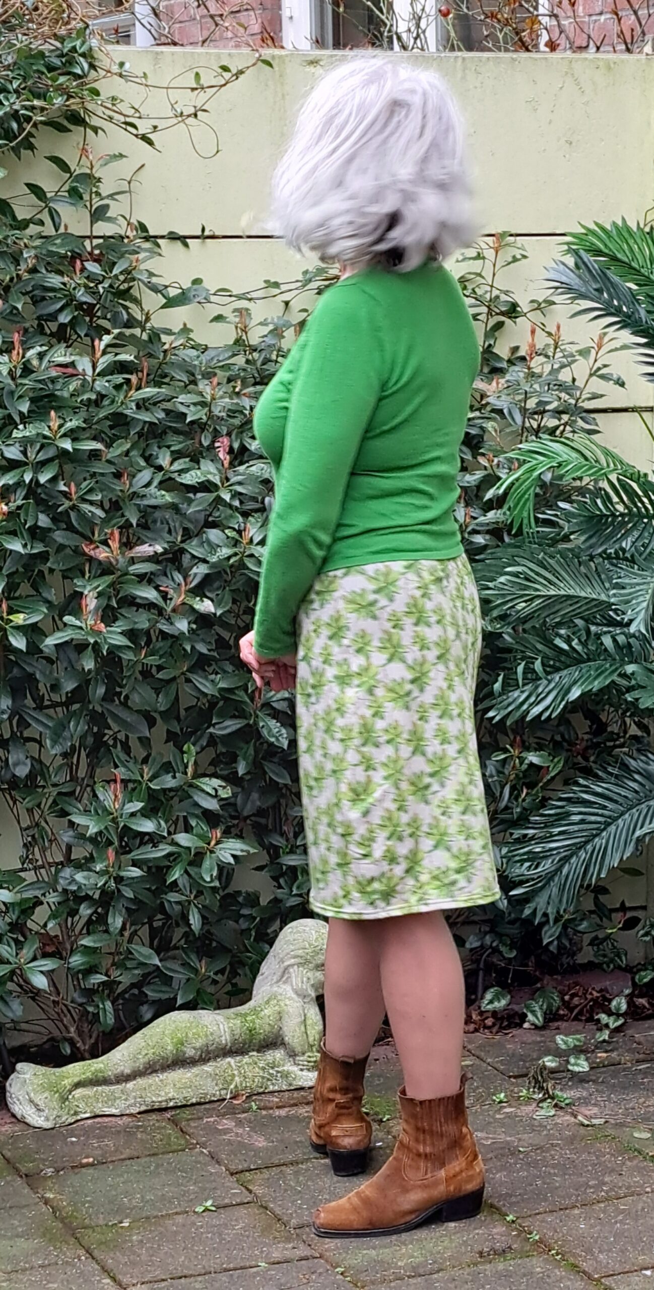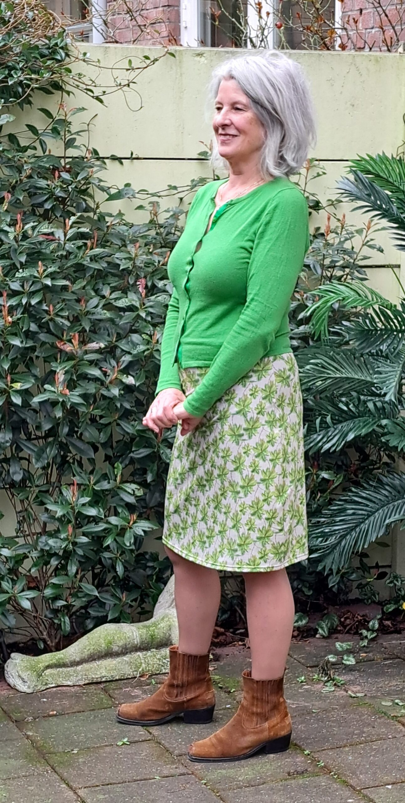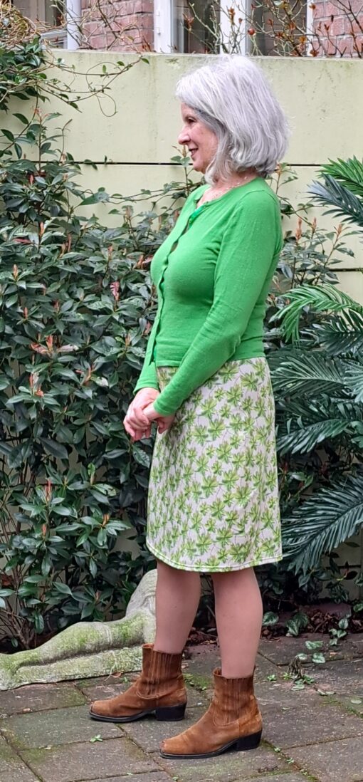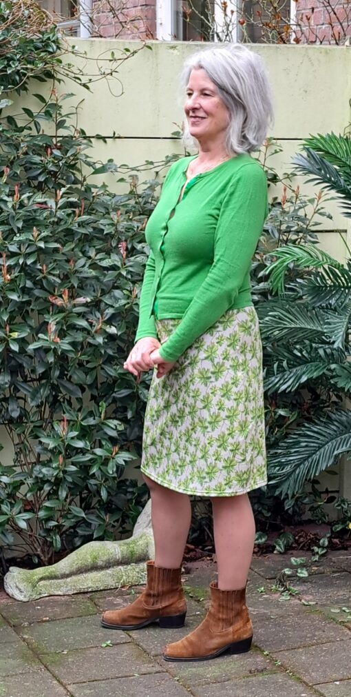 Rokje met een print van palmbomen op een ecru/lichtbruine ondergrond. 95% katoen en 5% elasthane